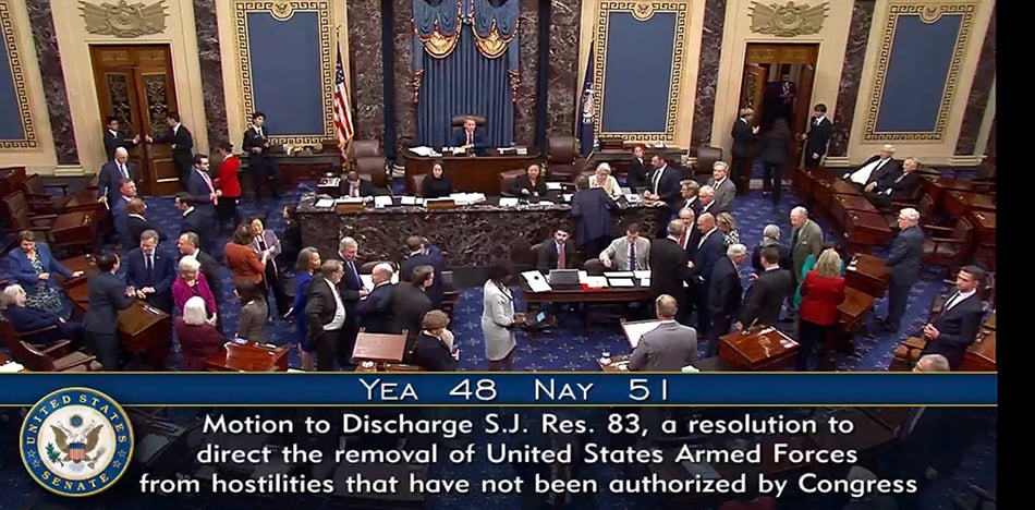 Con una votación de 51 a 48, la Cámara alta del Congreso rechazó invocar la resolución de Poderes de Guerra para limitar las facultades del presidente en esta materia, que había propuesto la bancada demócrata y que, en paralelo, impulsaba el congresista Gregory Meeks desde el Comité de Asuntos Exteriores de la Cámara de Representantes, conocido por su simpatía con el chavismo.