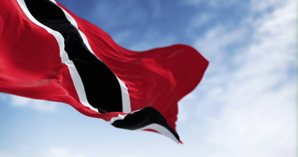 Detail of Trinidad and Tobago national flag waving. The Republic of Trinidad and Tobago is an island state in the Caribbean. 3d illustration render. Rippled fabric. Selective focus. Close-up