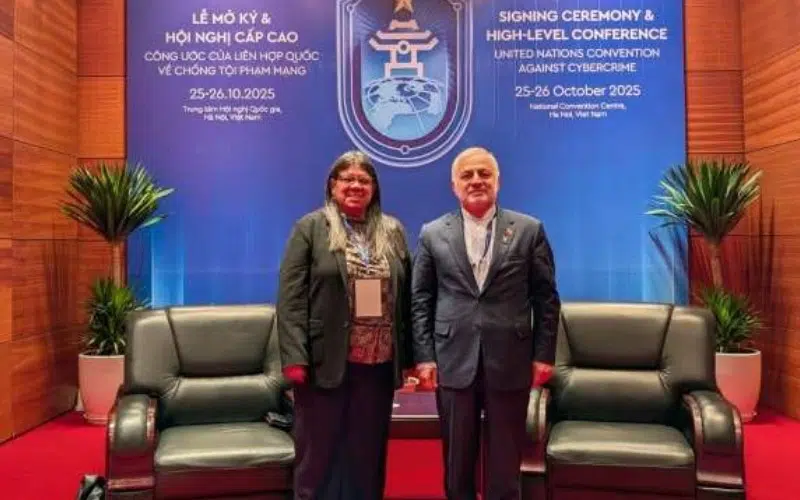 En el marco de la Ceremonia de la Firma de la Convención de las Naciones Unidas sobre la Ciberdelincuencia, la viceministra para Asia, Medio Oriente y Oceanía de Venezuela, Tatiana Pugh Moreno, sostuvo una reunión bilateral con el viceministro de Asuntos Consulares, Parlamentarios e Iraníes de la República Islámica de Irán, Vahid Jalalzadeh.