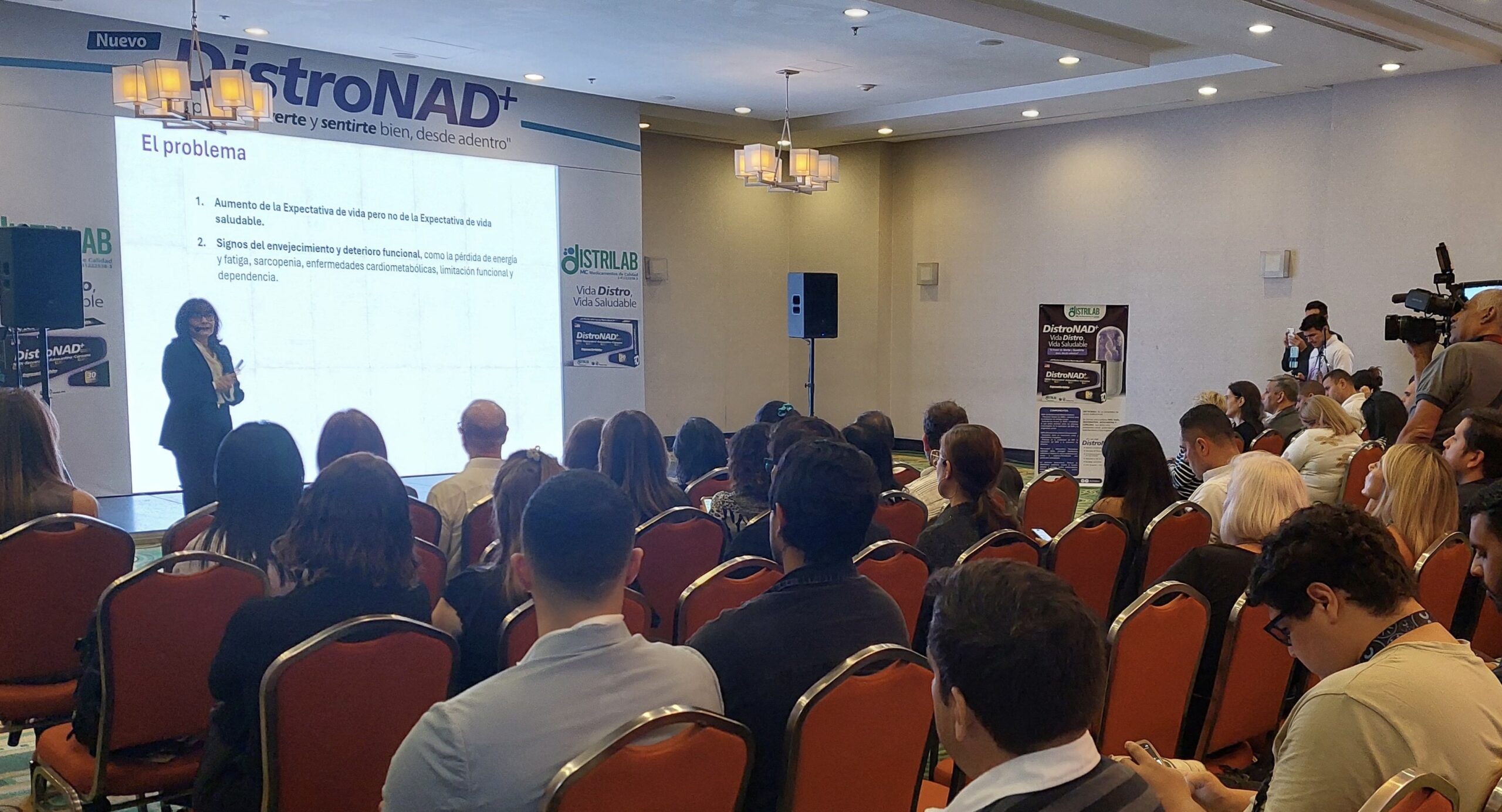 Durante la jornada, se presentó la ponencia “Evidencia científica de los componentes DistroNAD+”, a cargo de la doctora Patricia Mantilla Guevara, en la que se expuso un análisis detallado sobre el proceso del envejecimiento y se mostraron las evidencias científicas que avalan la efectividad de cada uno de los ingredientes de DistroNAD+