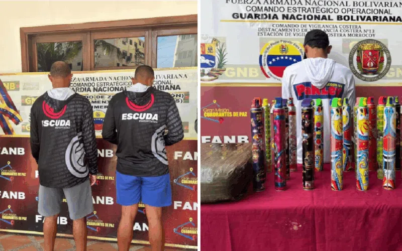 Comando de Zona N° 13 de la Guardia Nacional Bolivariana (GNB) en el estado Falcón informó que se llevó a cabo la detención de dos hombres y se incautó una embarcación por la presunta comisión de delitos ambientales en el Parque Nacional Morrocoy. Un tercer hombre, fue arrestado por venta de aerosoles tóxicos.